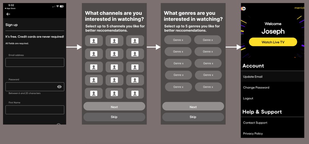 Crude Mockups. As a first step, to simply and quickly convey the idea to tech and business stakeholders, we produced a simple low fidelity wireframe with the current registration screens and the placeholder “crude” mockups (see above) to demonstrate the use case of allowing users to select desired channels and genres to complete registration. The next step after the crude mockup is the low fidelity wireframe.